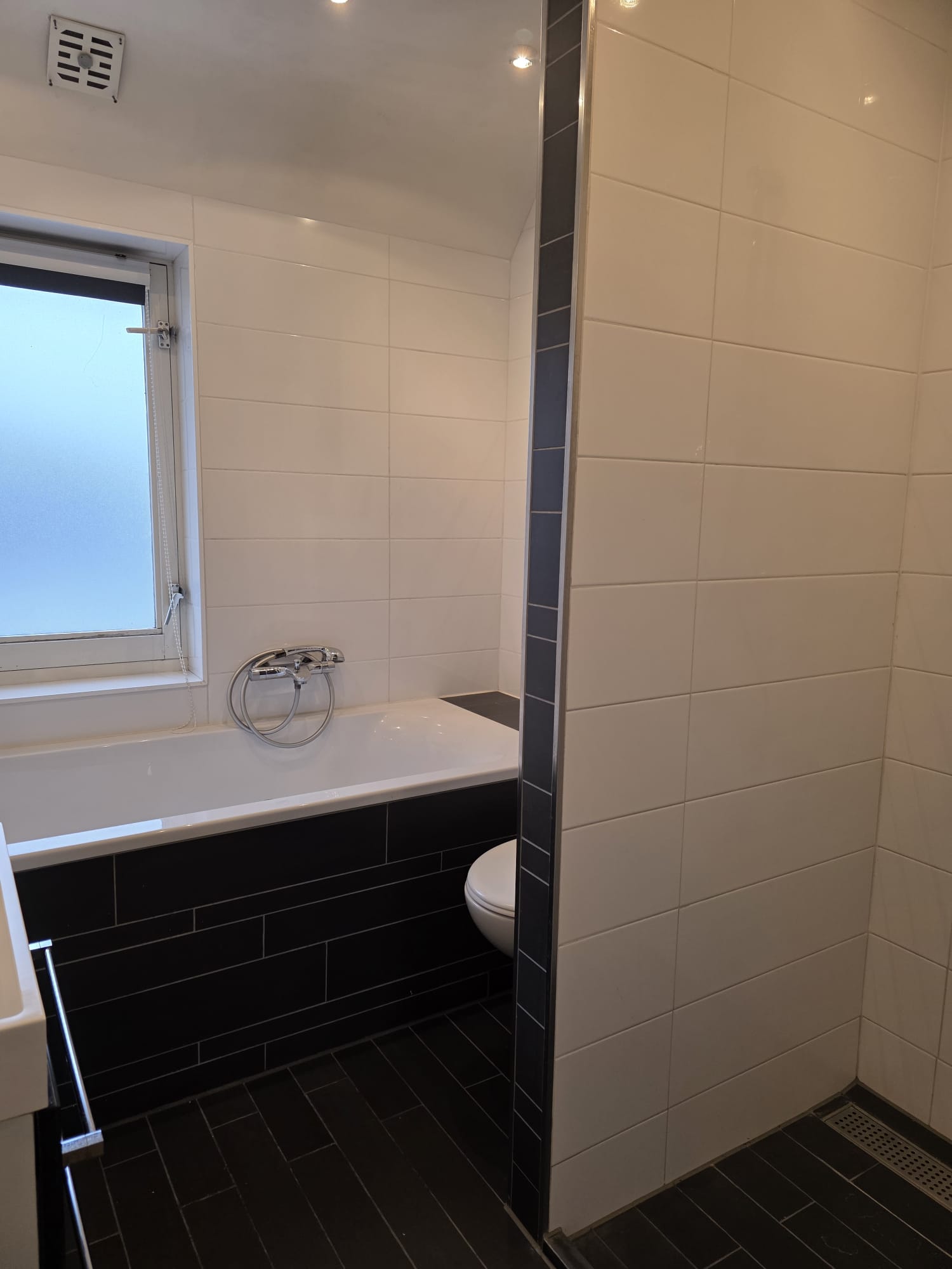 De geheel betegelde badkamer is voorzien van een wastafel met spiegel, ligbad en inloopdouche.