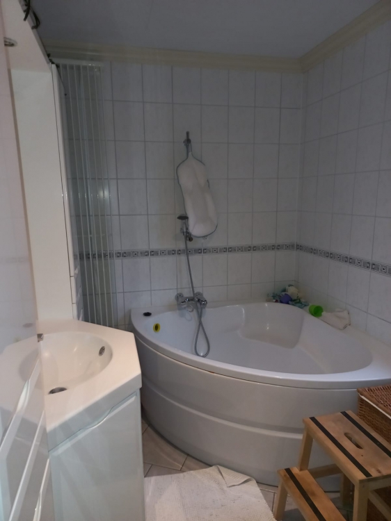 De nette geheel betegelde badkamer is voorzien van een douche, bad, en wastafel.