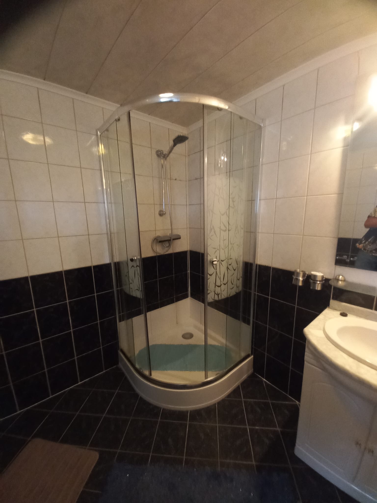De nette geheel betegelde badkamer is voorzien van een douche, wastafel en toilet. Tevens bevindt zich hier de aansluiting voor de wasmachine.
