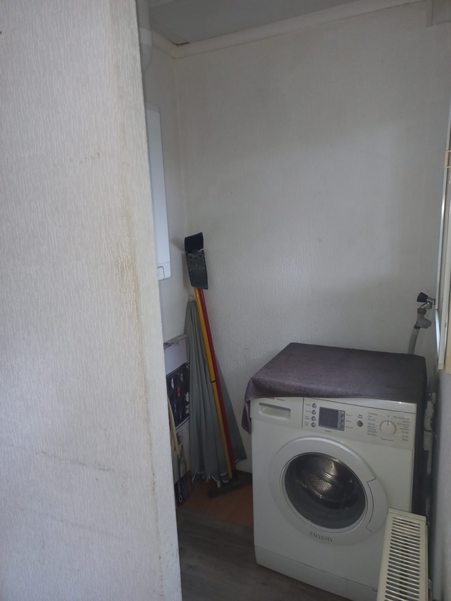 De nette geheel betegelde badkamer is voorzien van een douche, wastafel en toilet. Tevens bevindt zich hier de aansluiting voor de wasmachine.