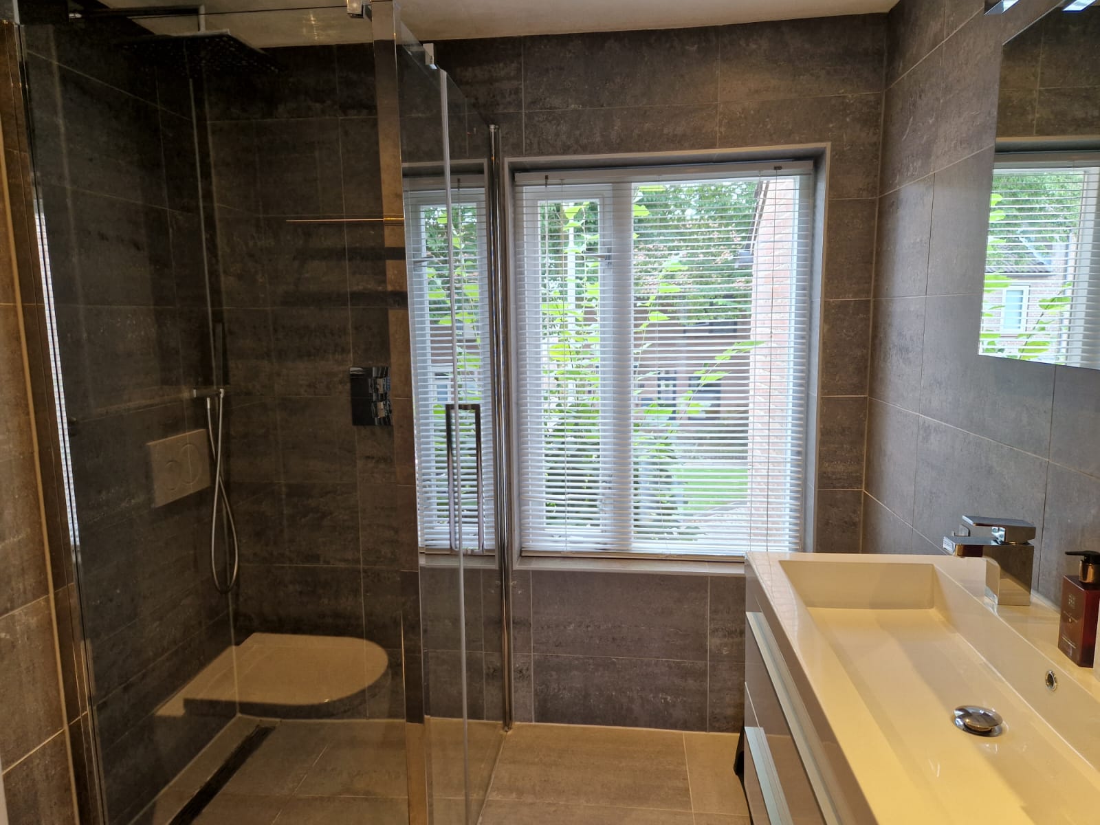 De moderne geheel betegelde badkamer beschikt over een riante inloopdouche, brede wastafel met twee kranen, grote spiegel met dubbele verlichting en een wandcloset.