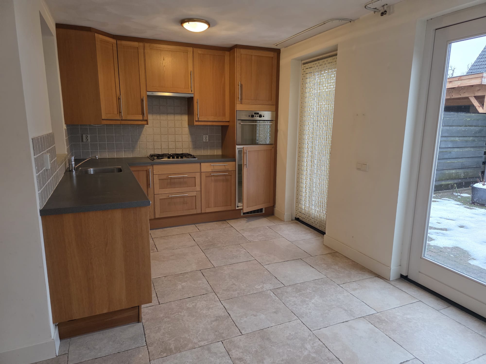 De keuken in hoekopstelling beschikt over een vaatwasser, kookplaat met afzuigkap, koelkast en combi-magnetron en koelkast. Ook is er voldoende opbergruimte aanwezig. Via de keuken krijgt u toegang middels openslaande deuren naar de tuin.