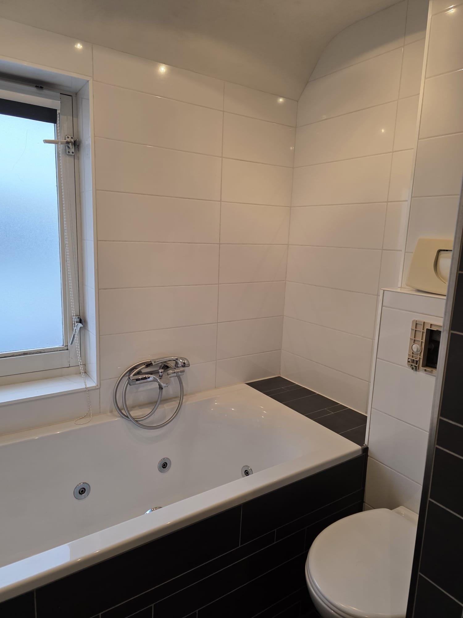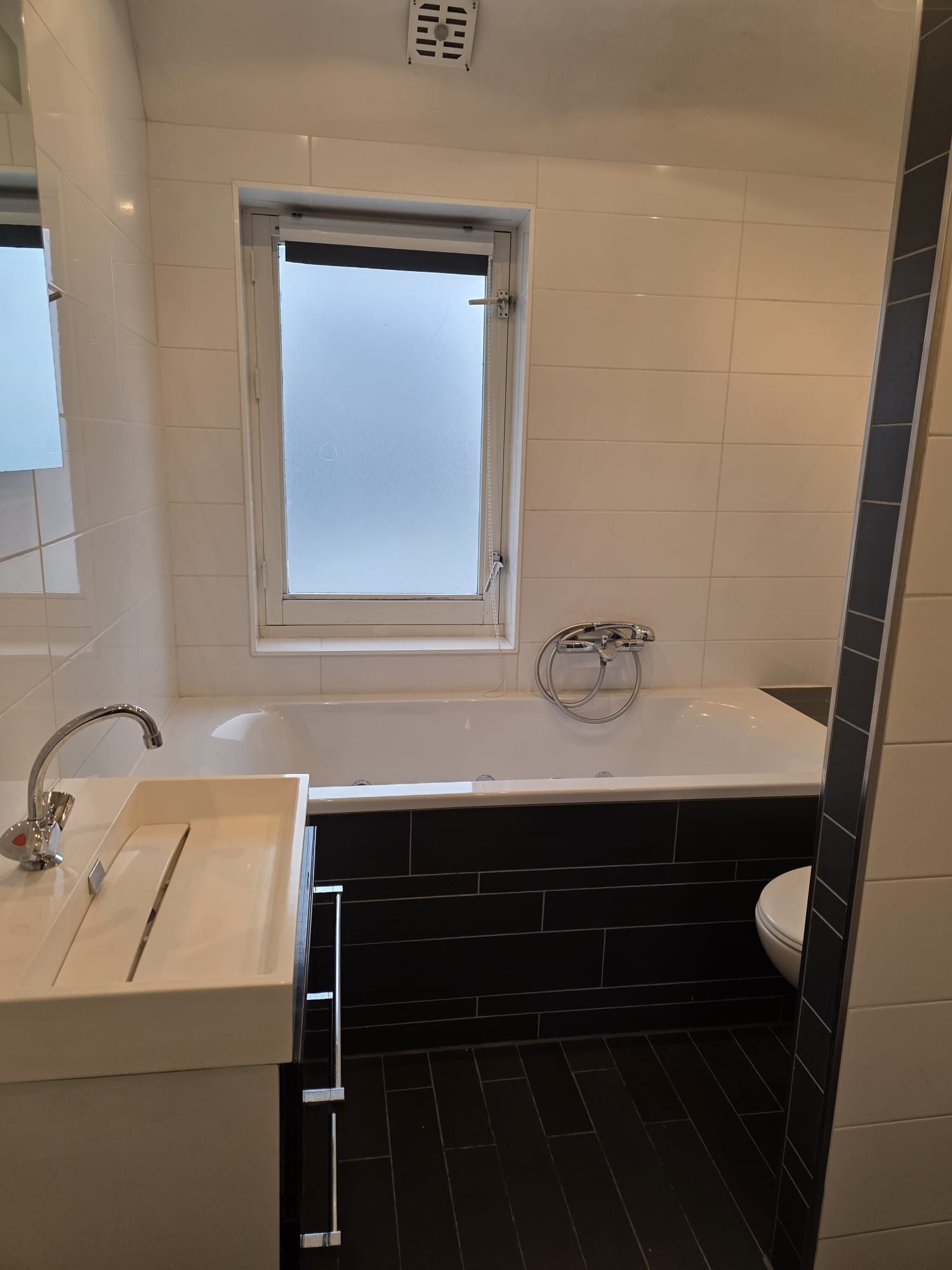 De geheel betegelde badkamer is voorzien van een wastafel met spiegel, ligbad en inloopdouche.